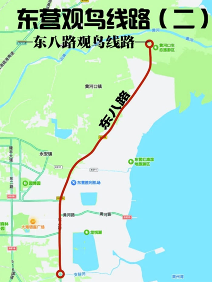 ②东营胜利机场——黄河口生态旅游区【全程约36公里】 出机场后沿路向北即可 ;
