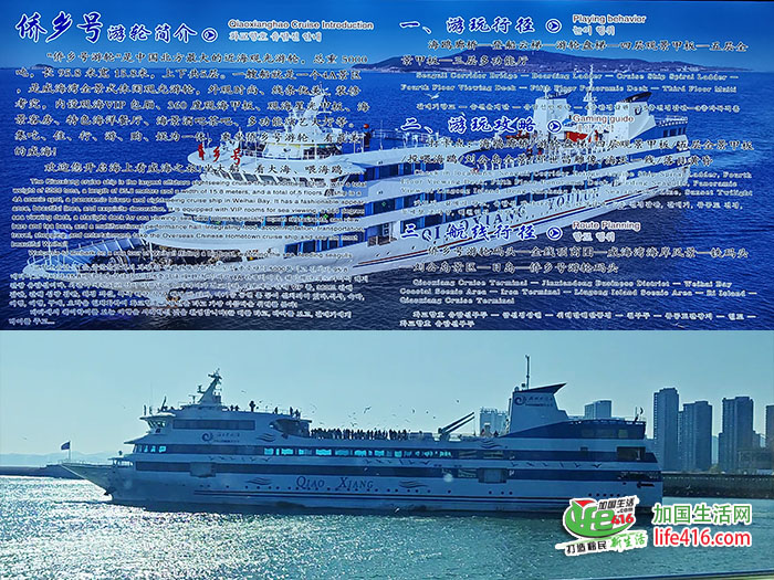 豪华海上游轮“侨乡号”总重5000吨的,总长95.8米,垂线间长83.8米,宽15.8米,型深(主甲板)5.40米,服务航速不少于15海里,续航力1000海里,载客量500人同时还可承接商务会议、论坛沙龙、海上聚会、海上婚礼、海上文化展览等一系列服务项目,可供四海来宾在威海享受一段难忘的海上之旅。