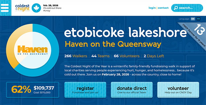 【加国生活网】“Coldest Night of the Year(一年中最冷的夜晚)”是一场同时在加拿大和美国举行的适合家庭参与的冬季徒步活动,旨在为“Haven on the Queensway”等当地慈善机构筹集资金,为遭受伤害、饥饿和无家可归的人们提供服务,今年是第13届。如果你感兴趣的话,请先到网上报名,再在2月28日参加加这个活动,一起组队、筹款、散步、聚集……外面很冷,请做好防护工作,具体参与流程请到以下官网查询。