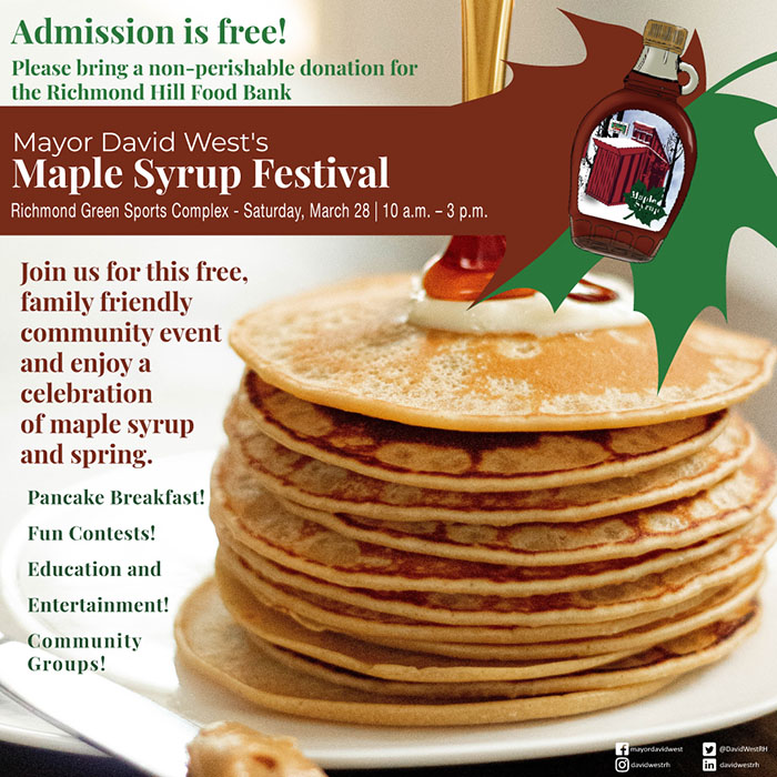 【加国生活网】这个周六,Richmond Hill市长David West将在Richmond Green Sports Complex举行又到了一年一度的枫糖浆节,今年是第10届。届时,现场有免费赠送含真枫糖浆的煎饼(数量有限),还有枫糖浆制作演示(及采样)、现场娱乐与音乐、有趣的互动展位,中午12点至3点还有马车游览。
