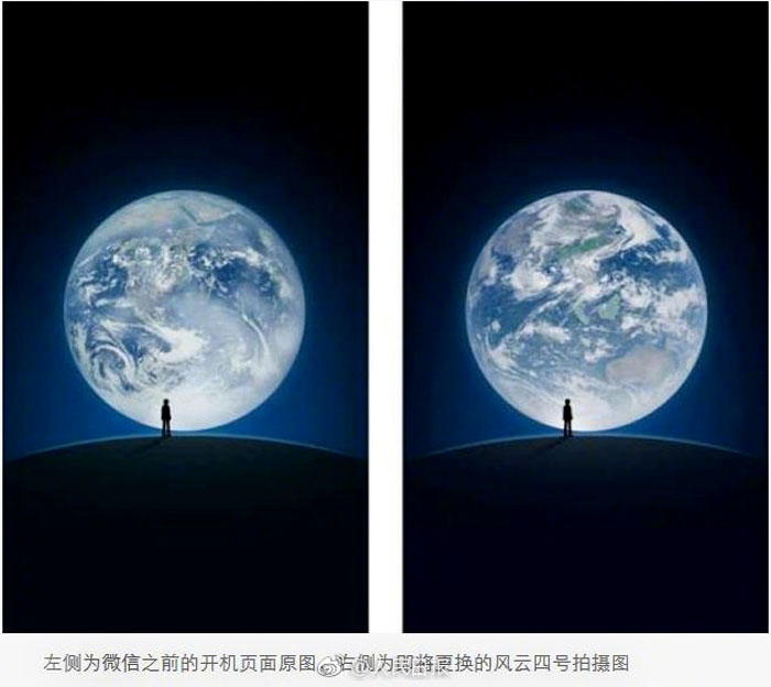 此前微信启动页中选用的照片素材是NASA在全世界范围公开的第一张完整的地球照片,名为“蓝色弹珠”,是人类第一次从太空中看到地球的全貌。此次呈现风云四号拍摄照片,是向祖国取得重大科技成就的一次献礼,寓意从“人类起源”到“华夏文明”的历史发展。