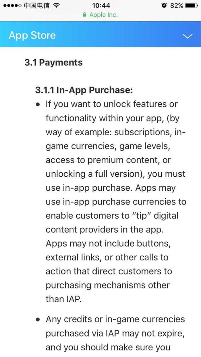 6月11日,澎湃新闻在苹果开发者网站上看到的更新版《App Store审核指南》指出,如果开发者想在iOS软件提供下述功能(比如用户订阅、游戏内虚拟货币、游戏级别、获取高端会员内容、或者提供完整功能版本等),则开发者必须使用软件内购买。