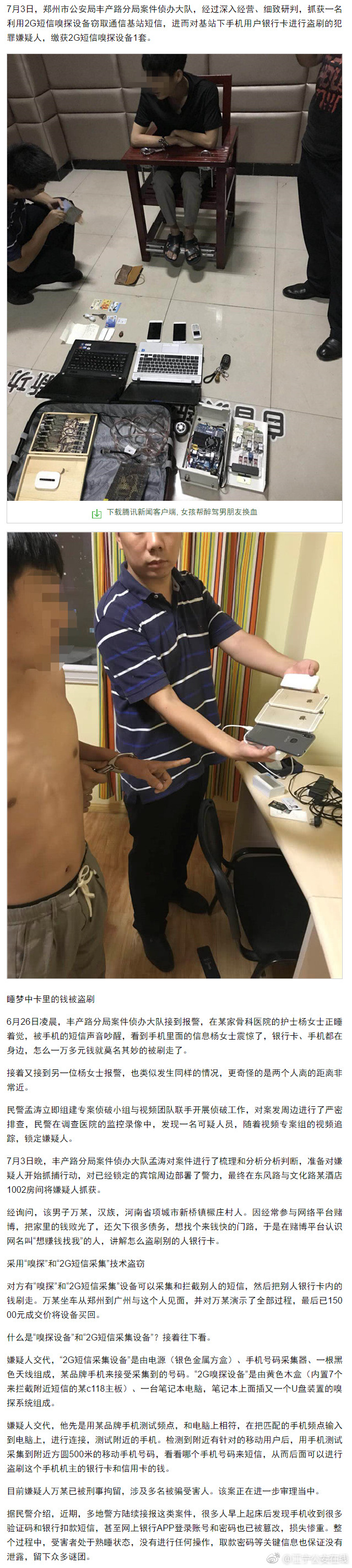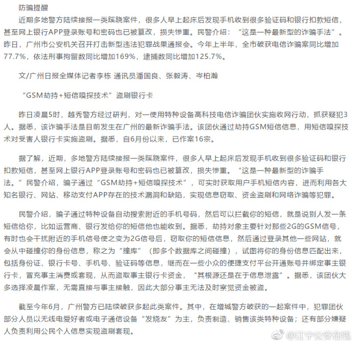 必须要说明的是,此类新型伪基站诈骗使用的方法是钻了手机信号协议的空子,对于普通用户来说基本上是无法防范的,也给警方的侦破工作带来了很大的挑战,因为涉及到的网站APP银行极其众多。