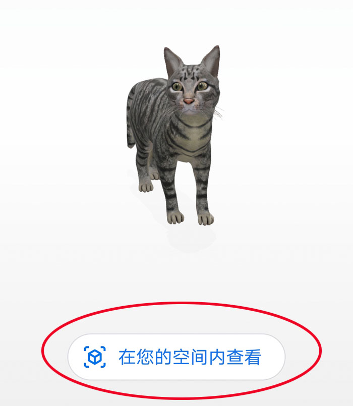 3、进入下个界面,立刻就会跳出一只“喵喵”叫的猫咪。注意,此时的界面一定要有画着红框的选项,即“在您的空间内查看”或“View in your space”。如果没有这一项显示,那说明你的手机还没有自动打开“ARCore”功能,或者手机型号不支持,或者没有安装“Google Play Services for AR”服务,或者使用的浏览器不对需要安装“Google Search”APP,具体技术说明见“一、所需设备和相关APP”。