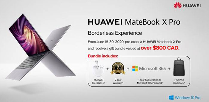 2020年6月15日至30日期间预订MateBook X Pro 2020更可获得超级大礼包:HUAWEI Freebuds 3主动降噪无线耳机,两年维保,一年免费Microsoft 365 Personal以及华为时尚电脑背包。