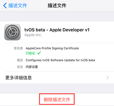 在描述文件列表里面,找到一个名为tvOS beta-Apple Developer v1的文件,打开它