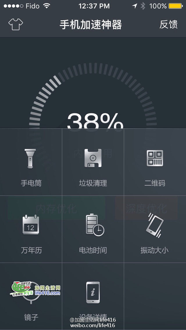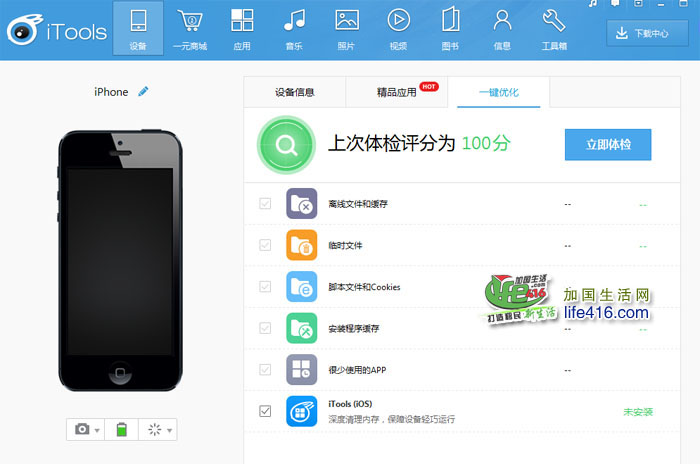9、这个APP还可清内存、管理电源,还有手电筒、镜子,功能挺实用啊,重要的是,不需要你去折腾什么越狱软件,一旦越狱不成功,苹果手机就不好用了。所以小编把这个“手机加速神器”推荐给大家。这个手机APP好象在加拿大境内的APP店里查询不到(也许在国内能够查询的到),需要先在电脑安装iTools 3,再连接手机到电脑,点一键优化,就会自动给手机装上了。