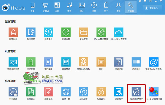 6、于是小编在电脑上安装了iTools 3(点击查看这里),连接手机到电脑,尝试使用里面的越狱功能,但是失败了,又仔细查询了一下,原来是小编苹果手机的iOS是最新版本9.3.2,iTools 3以及iFunbox还不支持这个版本的越狱,点击里面的文件管理,也没有看到和邮件目录相关的var目录。