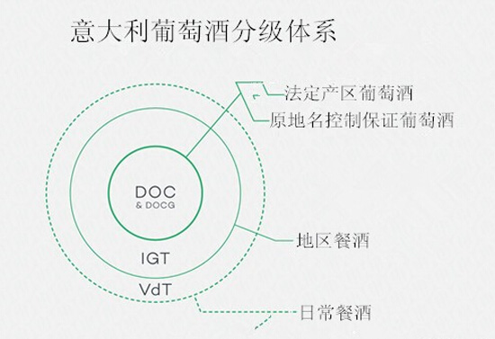 意大利的分级制度始于1963年,到目前为止,共有329个法定产区(DOC)和73个优质法定产区(DOCG)。起初意大利葡萄酒的分级体系是为了保护意大利当地的葡萄品种以及用意大利葡萄酿造的高端葡萄酒。当然意大利也会采用法国的葡萄品种像梅洛(Merlot)、赤霞珠(Cabernet)与超级托斯卡纳(Super Tuscan)混酿而成的高品质葡萄酒,但这些葡萄酒会被归于地区餐酒(IGT)的级别。