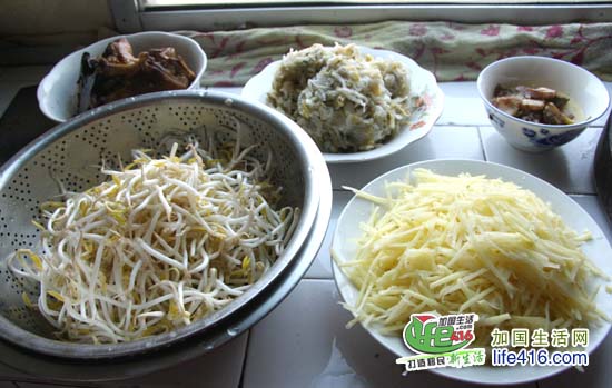 婆婆这次做的和菜是炒豆芽、炒土豆丝和炒酸菜。炒菜细节略过。