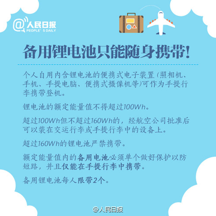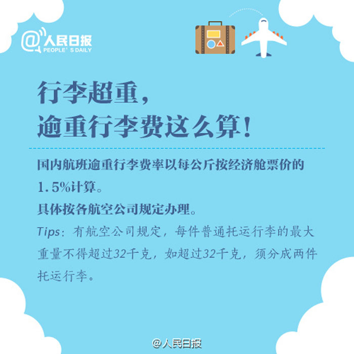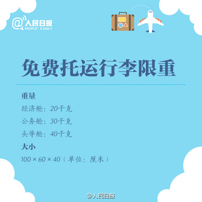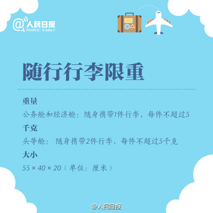 ①经济舱随行行李限1件,限重5公斤;②免费行李托运限重20公斤;③备用锂电池、充电宝只能随身携带,不能托运;④打火机、火柴既不能随身带也不能托运;⑤化妆品每种限带一件,容积不超过100毫升……国内航班行李规定,留存备用!
