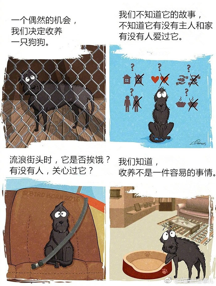 艺术家Bird Born 用画笔展示了自己领养狗狗之后的生活,“领养一只汪并不会带来翻天覆地的变化,但我们知道,世界上又少了一个不快乐的生灵,这就够了。”“领养一只汪并不会带来翻天覆地的变化,但我们知道,世界上又少了一个不快乐的生灵,这就够了。”