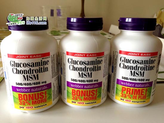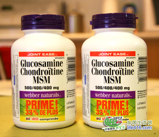 据说Glucosamine、Chondroitin 和 MSM是对付退化性关节炎最新的营养补充品配方。毫不犹豫地买了下来,一瓶20多加币,两瓶抵得上一瓶lakota了。