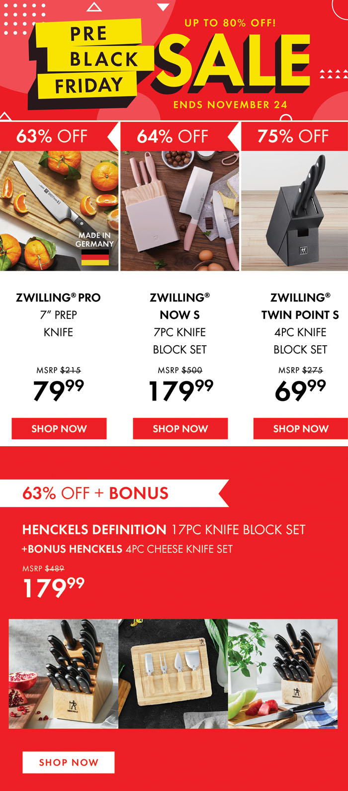德国著名厨具品牌双立人(Zwilling)从本周起提前进入黑五预售模式,在线购买所有产品up to 80% off,至11月24日结束,再在11月25日开始黑五当天的打折。如果你问当天一定会比预售便宜吗?加国生活网小编觉得买的没有卖的精,预售基本上是把今年黑五的打折基调定下来的,当天再便宜也不会便宜太多,再考虑到送货或邮寄等配套服务,避开黑五当天抢购高峰,或许也是一个明智的选择。