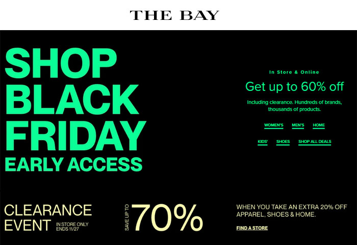 【加国生活网】加拿大Bay商场从本周起提前进入黑五打折促销模式,好多产品在打折的基础上再有额外20% off,大家赶紧去淘货去吧。小编感觉别等下周五了,因为黑五打折力度肯定不会是全年最最便宜的,如果你已经看好了某个款式的衣服或鞋子,趁着现在还有货就赶紧下手,等下周五再去,估计毛都没了。
