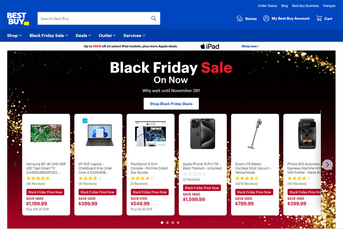 【加国生活网】Best Buy也在今年提前一周开始进行黑五打折促销,很多商品打折的力度很诱人,比如大电视优惠$600、苹果iPhone 15 Pro 1TB 优惠$600至$1600就能拿下;耳机和扬声器优惠44%;智能手表优惠$230;空气炸锅和立式搅拌机等厨房小家电的优惠up to 40% off等等。更多详情请到官网查询:https://www.bestbuy.ca/en-ca