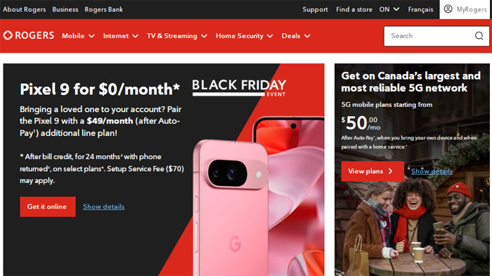 RogersRogers的黑五促销活动包括新手机打折和套餐打折。您可以以每月$2起的价格购买带有128GB数据的新款 iPhone 16,以及以每月$0的价格购买三星 Galaxy S24 或 Google Pixel 9,须签两年合约。如果您有手机但想更新手机计划,罗杰斯还提供每月$50起的5G网络手机套餐计划。更多优惠可点击此处