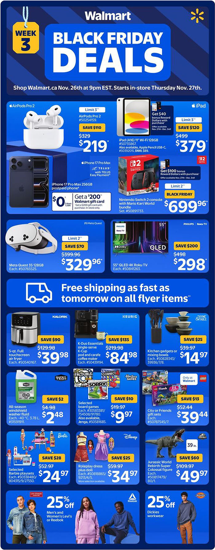 Walmart的黑五促销是从11月27日开始的,网站促销则是从11月26日晚9点就开始了,电子产品、运动器材和家居用品等商品的折扣高达60%;玩具、电器和家具up to 50% off;电子游戏和个人护理用品up to 50% off。更多详情请点击链接查看优惠Flyer:https://www.walmart.ca/flyer