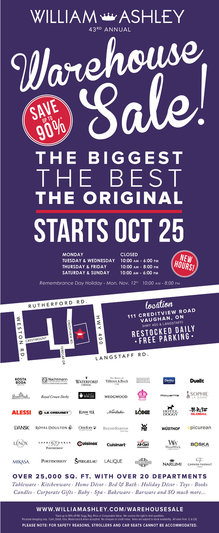 【加国生活网】每年都是圣诞节前一个月举行的William Ashley Warehouse Sale今年又早早地在10月底举行了,感兴趣的朋友不妨去看看,今年是第43届。现场有厨房用品、家居用品、浴室用品、儿童玩具等。这个Warehouse Sale在西人社区相当有名,许多人甚至开几个小时的车从安省北部到这个 Warehouse Sale来扫货。要知道,这个Warehouse Sale 里全部是知名品牌,包括Wedgwood、Denby、Doulton、Waterford、Riedel 等等,全场最高优惠 90% off,能以超低的价格买到超好的产品。