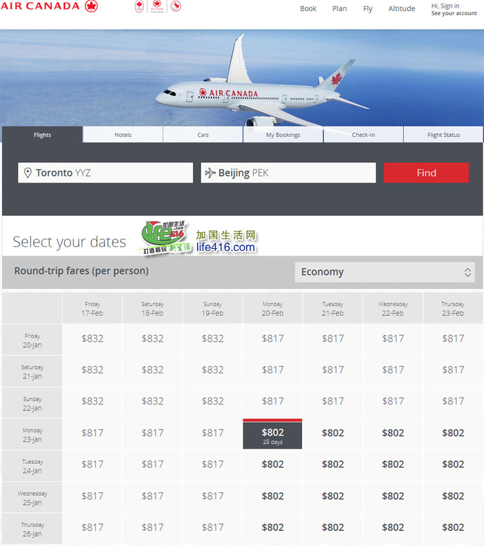 加国生活网小编到加航查询了一下由多伦多飞北京的往返机票(同样以春节前后一个月为往返日期),机票价格为$802(含税),这个机票价格或许不是最最便宜的(2016年年初的时候曾低至800以下),但也是很便宜的价格了,想回国过春节的华人朋友赶紧去订,这个优惠价格到9月13日截止哟。