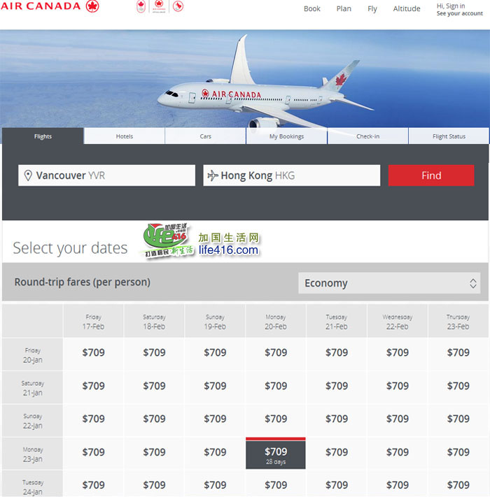 而加航推出的$709加元(含税)的机票,提供可选择的时段更多,更包括农历新年在内(2017年1月28日是大年初一,小编查询了一下春节前后一个月的往返日期,见下图),订购优惠机票由即日起,到9月13日止。