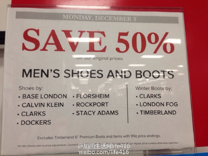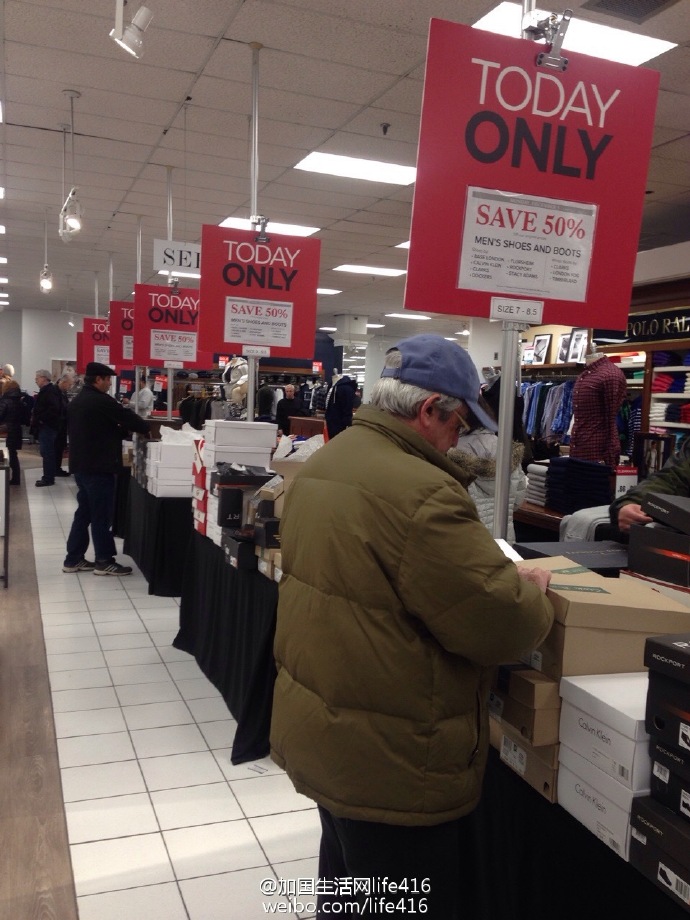 【加国生活网专稿】男人如果购物疯狂起来一点儿也不比女人差啊。原因是加拿大BAY商场男鞋部2016年12月5日这一天(仅这一天哟)大部分牌子五折促销50% off,打折的牌子见下图,现场就象飓风扫过一样。还是那句话,不要迷恋黑五,那就是传说,哈哈!!