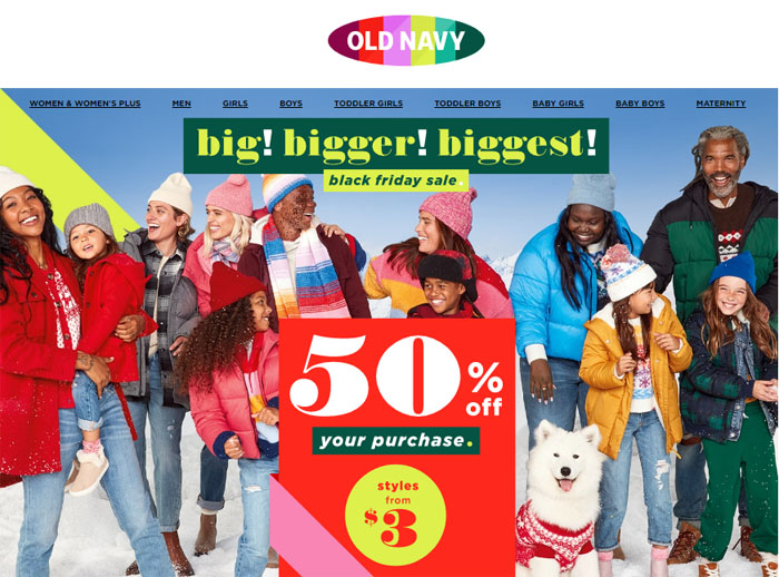 BLACK FRIDAY当天全场和网站全部五折,许多款式从$3起。网址:http://www.oldnavy.ca/