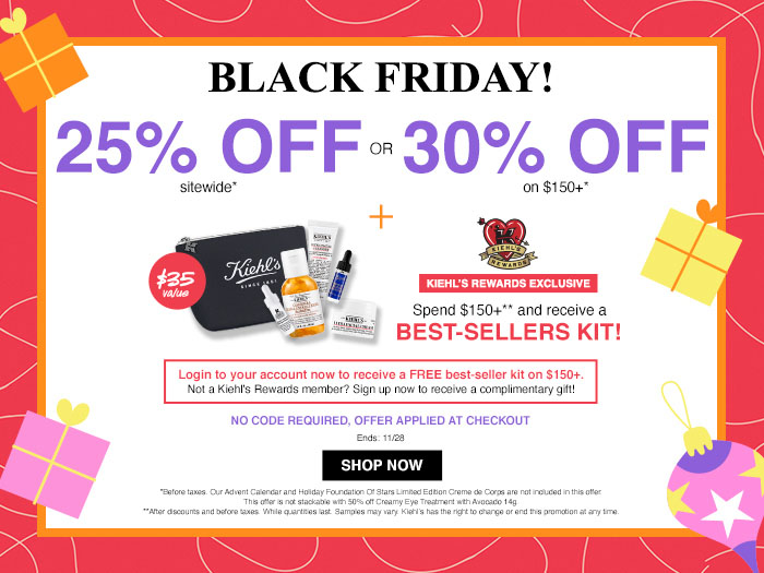 【加国生活网】Kiehl's 的黑五促销是网店所有产品75折,如果一次购物满$150,还有价值$35的免费六件套赠送,详情:https://www.cineplex.com