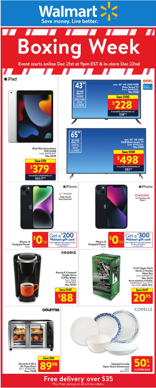 加拿大Walmart的BOXING WEEK大战也终于打响了,线上是12月21日晚9点开始的,实体店是12月22日开始的,促销FLYER的日期是从12月21日至12月28日,小编看了一下,感觉so far so good,详情请点击:https://www.walmart.ca/flyer?locale=en