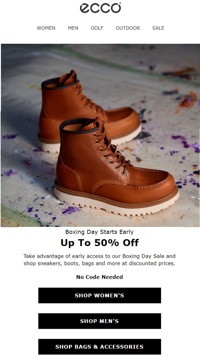 加拿大ECCO鞋店也提前开始Boxing Week促销了,up to 50% off,更多打折信息请到官网查询:https://ca.ecco.com/en
