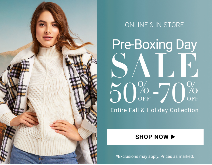 Suzy Shier服装店也在进行Pre-Boxing Day促销,所有秋季和圣诞新款50%-70% off,打折力度很大哟,快去实体店或网店淘宝吧:https://suzyshier.com。