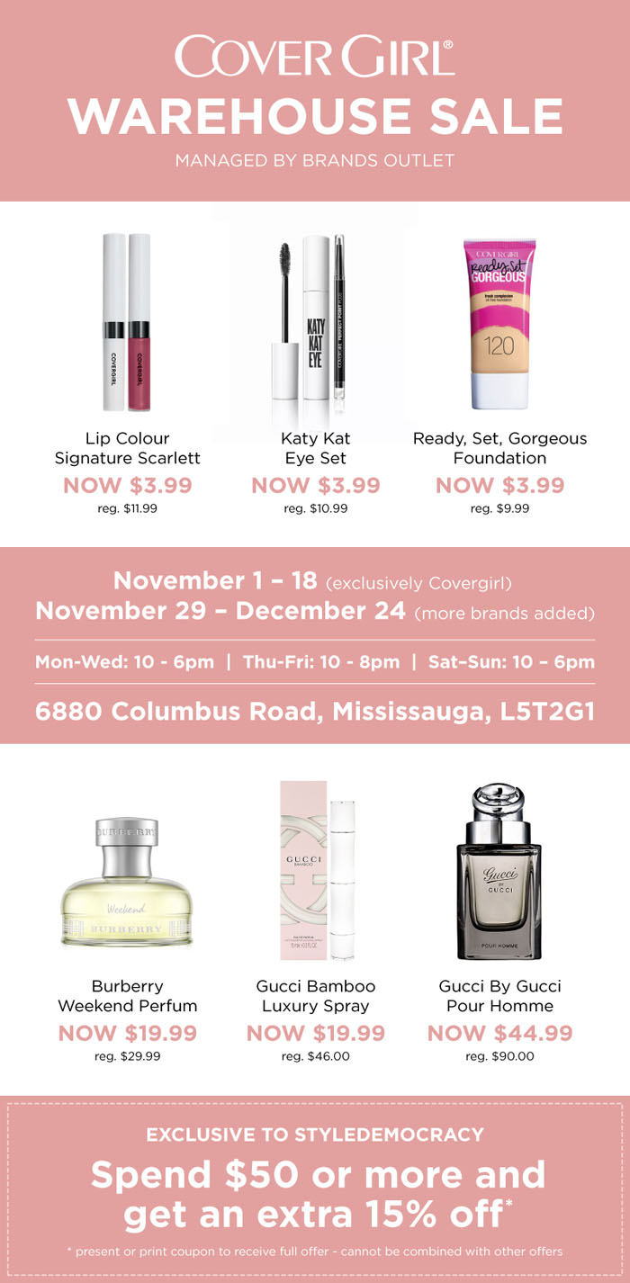 【加国生活网】CoverGirl是美国著名彩妆品牌,也是科蒂集团旗下主要产品之一。自1961年在美国推出第一款粉底产品以来,Cover Girl是美国最受年轻女孩喜爱的时尚彩妆品牌。它的所有产品都经过严格的质量检验和防/抗敏感测试,是美国销量最大的一个彩妆品牌。小编个人感觉这个牌子是北美最大众化的一个彩妆品牌,走的是平民路张,种类很多,价格也相对来说便宜。而且如果遇到Warehouse Sale,那就更便宜了。告诉大家一个好消息,CoverGirl Warehouse Sale将从2018年11月1日至11月18日举行,想去买彩妆的朋友们不要错过。如果你购物满$50,记得在收银处把下图的COUPON给收银员看一下,还有额外15% OFF的优惠!!