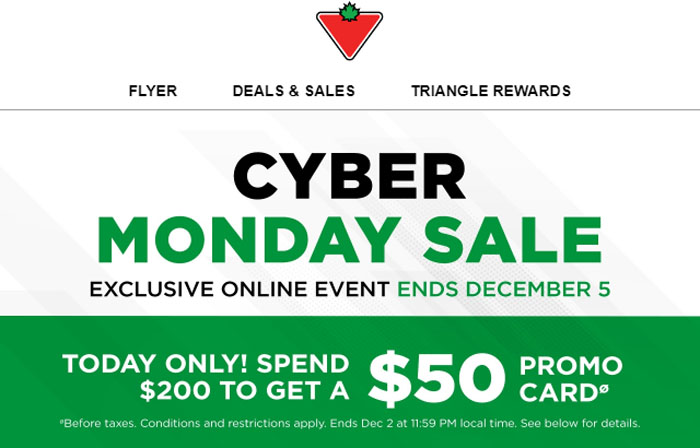 Canadian Tire Cyber Monday Deal是在线购物满$200送价值$50的Canadian Tire的礼品卡,更多当天促销请点击这里。