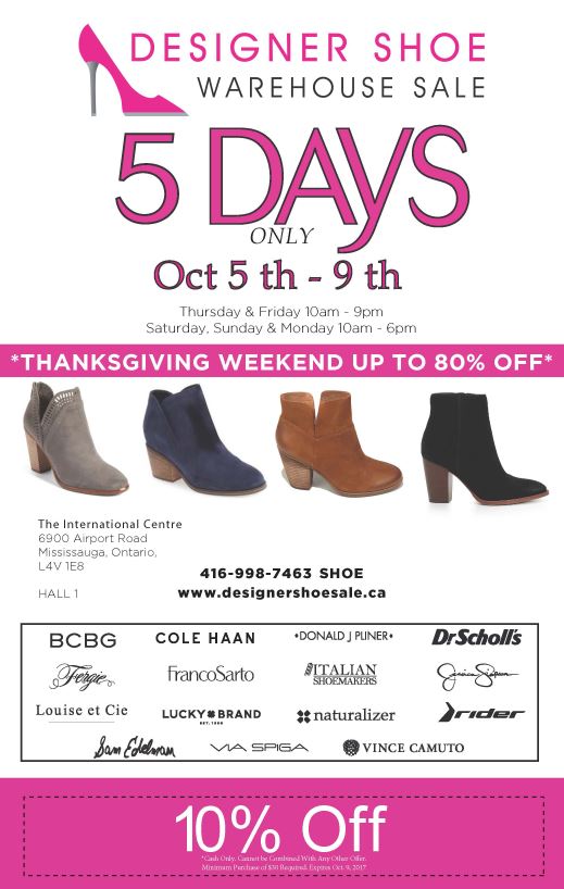 【加国生活网专稿】爱鞋的朋友们快来看!Designer Shoe Warehouse Sale 又要开始了,这个长周末将在International Center 举行。届时,将有3 万多双由名师设计的秋冬季新款鞋、靴up to 80% OFF打折促销,品牌包括Franco Sarto, BCBGirls, Via Spiga, Naturalizer, Jessica Simpson, Etienne Aigner and Fergalicious 等等,5-11号尺寸也挺全的。感恩节那天也开门,不要错过,免费入场。