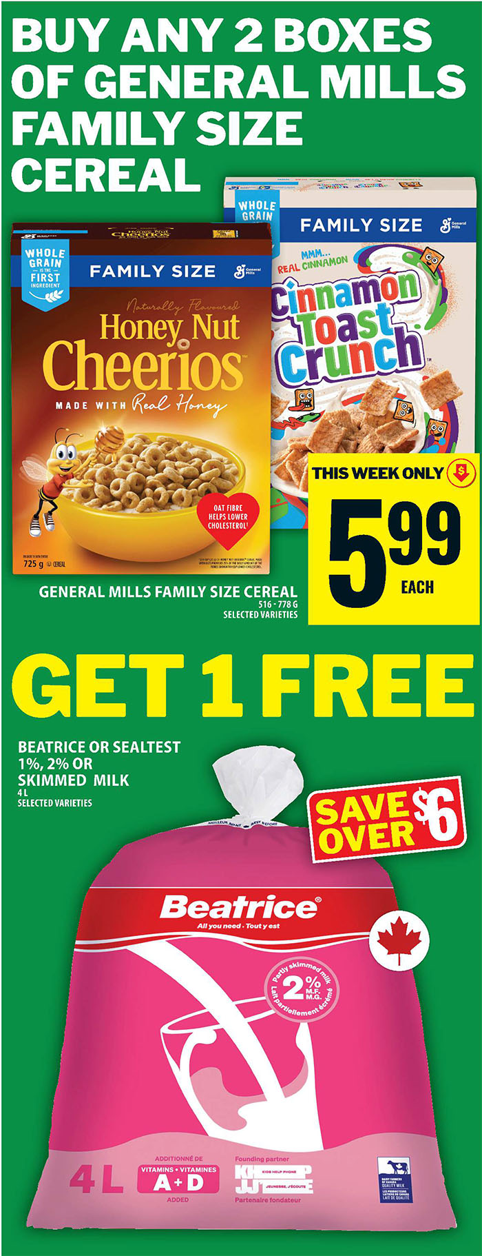 这其中,最吸引小编眼球的促销见下图:买任何两盒General Mills 家庭装Cereal,免费送1袋Beatrice or Sealtest 1%, 2% or skimmed milk 4L牛奶。