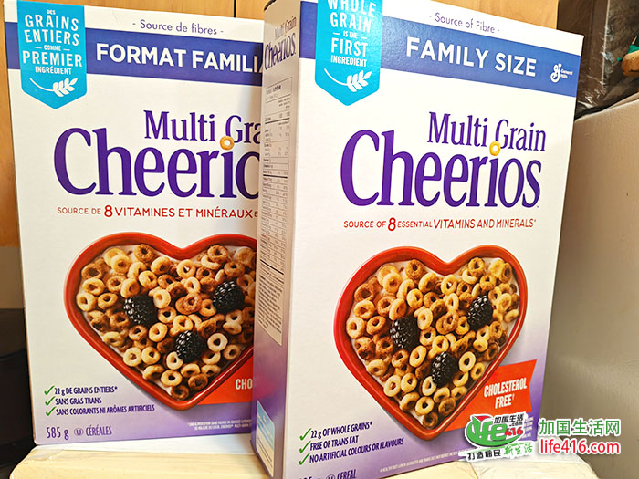 小编购买的是下图2盒General Mills 家庭装Cheerios Multi Grain(含有全麦燕麦、全麦玉米以及铁、维生素B3、维生素B5、维生素B6、叶酸等维生素和矿物质),也是加拿大心脏与中风协会推荐的比较健康的食品。