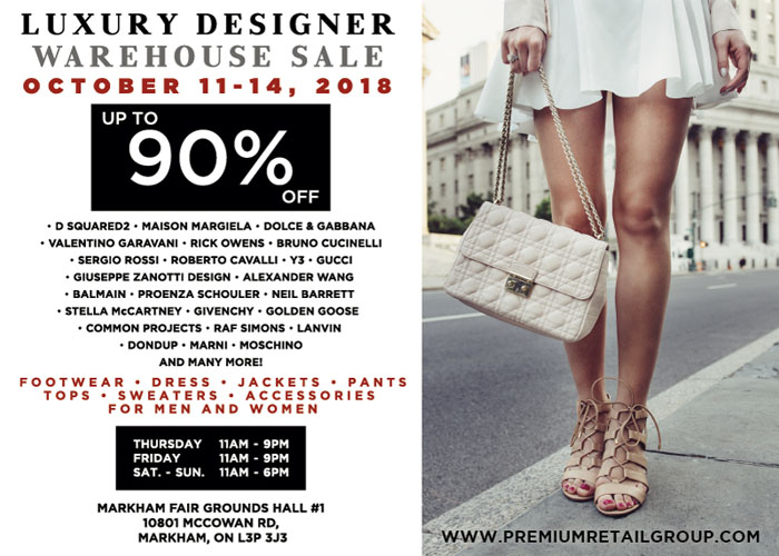 【加国生活网】由Premium Retail Group主办的Luxury Designer Warehouse Sale将于10月11日起在Markham Fair Grounds举行,历时4天。届时许多著名品牌的服装服饰鞋帽全场up to 90% off,具体品牌见下图。小编知道Premium Retail Group这些年来一直主办的是以Guess为主的warehouse sale,此次的Luxury Designer Warehouse Sale应该是初次举办,至于现场这些奢侈品牌产品的质量如何不得而知,还请大家擦亮眼睛,也欢迎大家反馈。
