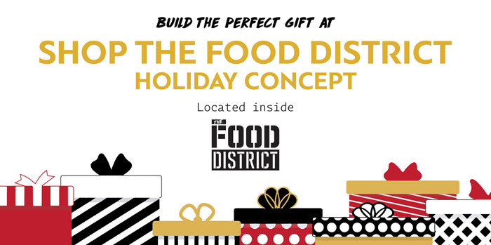 从 11 月 29 日至 12 月 24 日,客人可以访问位于美食专区的美食专区购物概念。购买礼品卡,以便用于购买美食专区内店铺制作的本地手工优质产品并组合自定义礼盒。购物满 $25 元即可享受免费礼品包装。请访问 www.shopfooddistrict.com/district-events,了解更多信息。