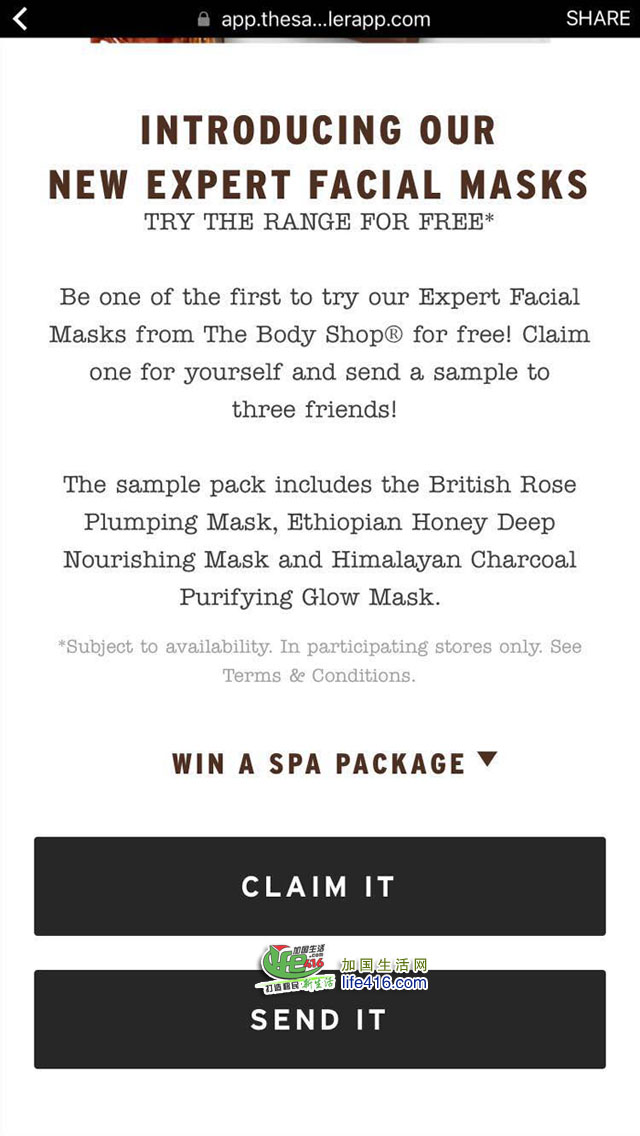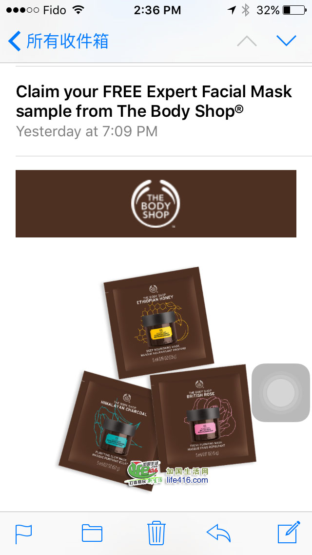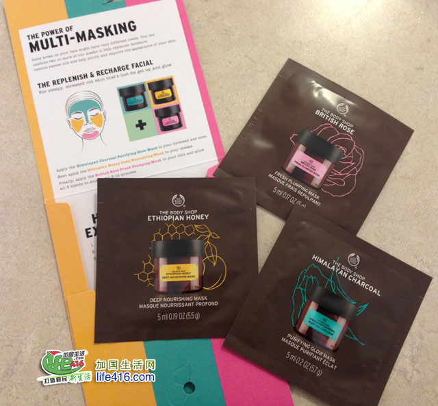 【加国生活网】加拿大The Body Shop在其官方Facebook上赠送免费面膜样品了,请点击这里,进入Facebook申请界面,点击“Claim”,再输入相应信息,和你Facebook相连接的邮箱就会收到一封邮件,里面有个PDF文件,是个优惠券,可以打印,也可以不打印存在手机里。最后凭此优惠券(打印或用手机显示均可)去离你最近的The Body Shop店去领即可。由于数量有限,请尽快去领。全加拿大均有效。