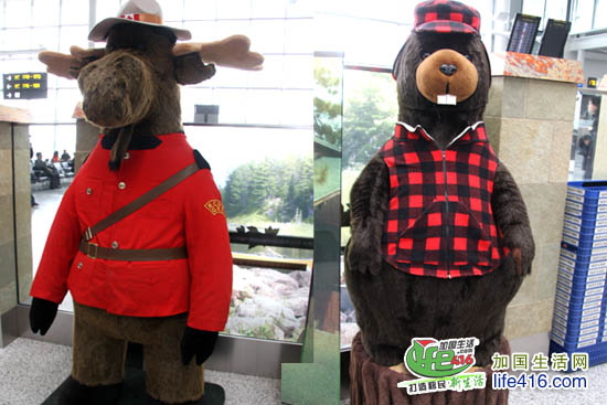 其中一个免税店门口有两个代表加拿大的“动物”守着大门:加拿大麋鹿和土拨鼠。