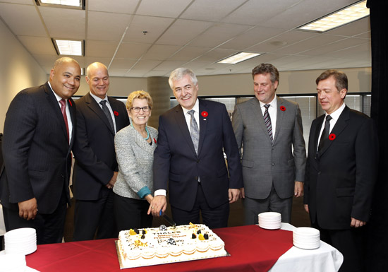 省长韦恩于11月10日一早探访交通系统制造公司Thales Canada,与公司负责人一起庆祝赢得来自世界各地的庞大合约。左为安省旅游、文化及体育厅厅长高图(Michael Coteau)。