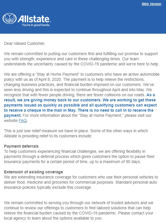 Allstate 加拿大公司宣布,将以一次性 “居家付款” (Stay at Home Payment)形式向其加拿大汽车保险的客户退钱,金额为 5 月保费的大约 25%,该公司在加拿大的退款总额将超过 3000 万加元。