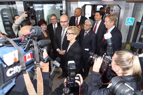 安省省长韦恩于4月22日在市中心联合车站宣布,联合车站(Union)与皮尔逊机场(Pearson)的联合机场快车将于6月6日正式投入服务。在她右旁的为安省交通厅厅长邓德华(Stephen Del Duca)。