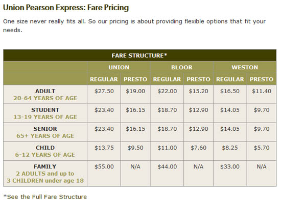 1、成人单程27.5元(联合车站至皮尔逊机场);使用Presto卡为$19元。学生、老人和儿童,可以获得折扣价。家庭票是$55元,不可使用Presto卡。