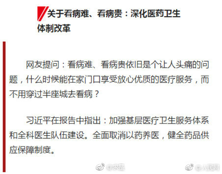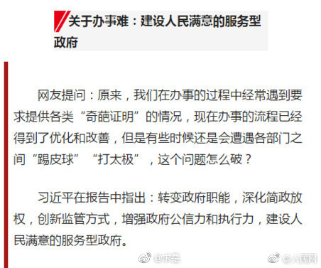 ①关于办事难:建设人民满意的服务型政府;②关于收入:经济增长的同时实现居民收入同步增长;③关于住房:坚持房子是用来住的、不是用来炒的;④关于看病难:深化医药卫生体制改革…