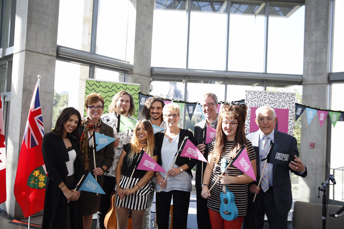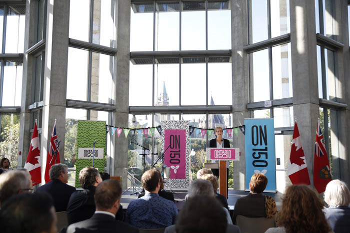 省长韦恩安省展开了“安省150”(Ontario 150)的筹备工作,以配合加拿大成立为联邦150年周岁的庆祝活动,随后与现场的表演人员合照。图右为安省基建厅厅长薛雅礼,左二为安省旅游、文化及体育厅厅长麦玛康。