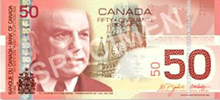 50元纸币上的人物:William Lyon Mackenzie King —— 加拿大第十任总理(10th Prime Minister of Canada),之后又任两届总理,是英联邦历史上在位时间最长的一位总理