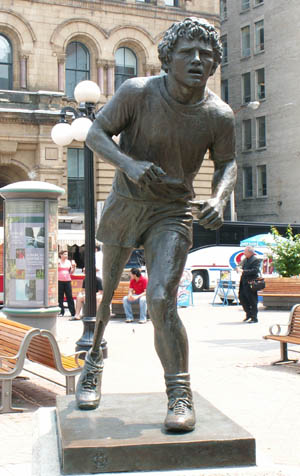 加拿大著名的癌症斗士。Terry Fox 是加拿大一位平凡青年,18岁时被检查出罹患癌症而被迫截去右腿。年轻的他并没有放弃生命,持续在医院里接受各种治疗与复健,同时主动鼓励医院里的其它患者要勇敢的面对病魔,决不轻易放弃生命。1980年4月12日,他戴上义肢,穿上跑鞋,开始了称为“Marathon of Hope”的长跑活动,为癌症研究来募款。他从Atlantic省出发,决定横贯整个加拿大。他的勇气与意志感动了大家,许多人纷纷慷慨解囊。不幸的是,1980年9月1日,由于癌细胞已快速的蔓延到他的肺部,他不得不在 Thunder Bay 停下了脚步。143天来他一共跑了5376公里,更换了九条义肢,募得了2417万巨额。1981年6月28日,年仅22岁的Terry离开人世,留下了埋藏在所有人心中的感动。