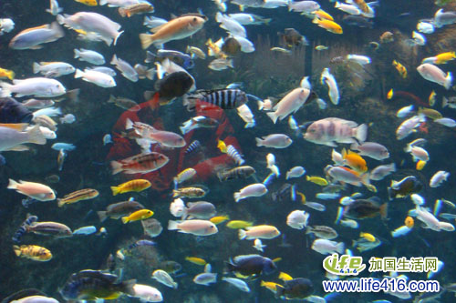 那些五彩斑斓的小鱼整整占据了一面墙,十分壮观
