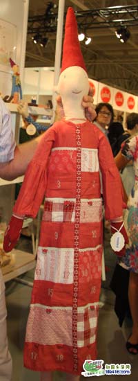 这个娃娃不仅是个挂在墙上的娃娃,她是个日历式的记事本,上面的数字都是日期,有什么事可以把纸条插入袋袋里或是挂在那里。